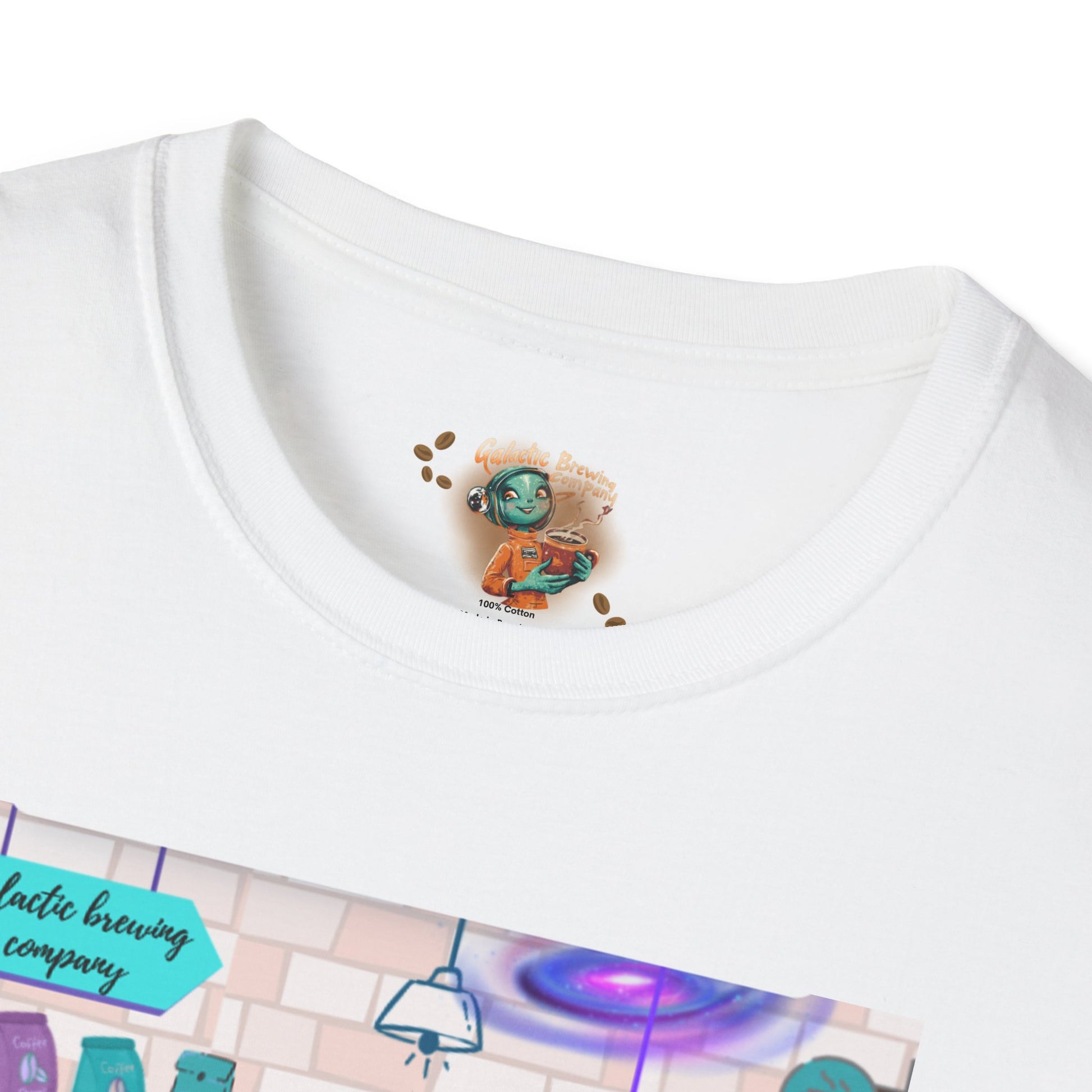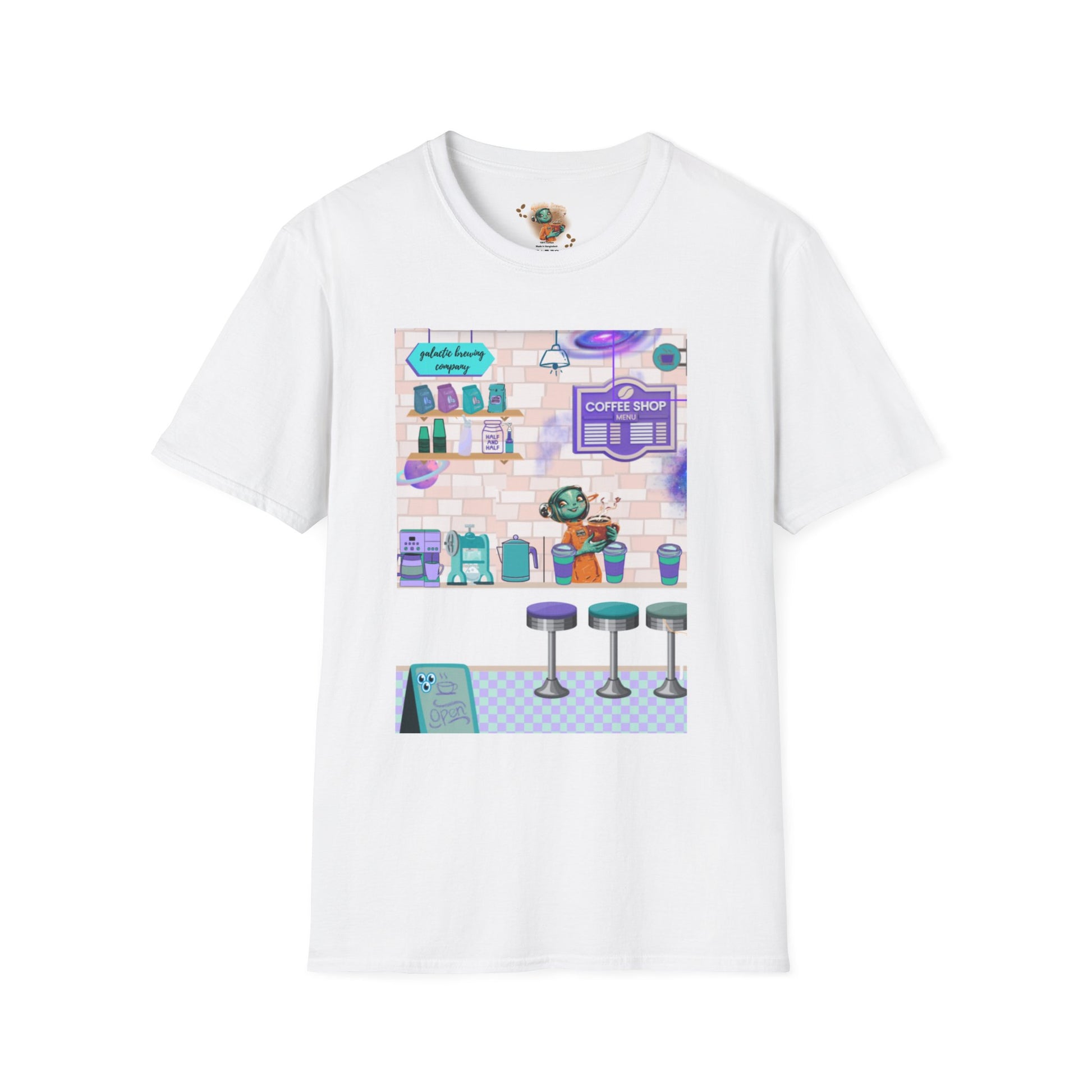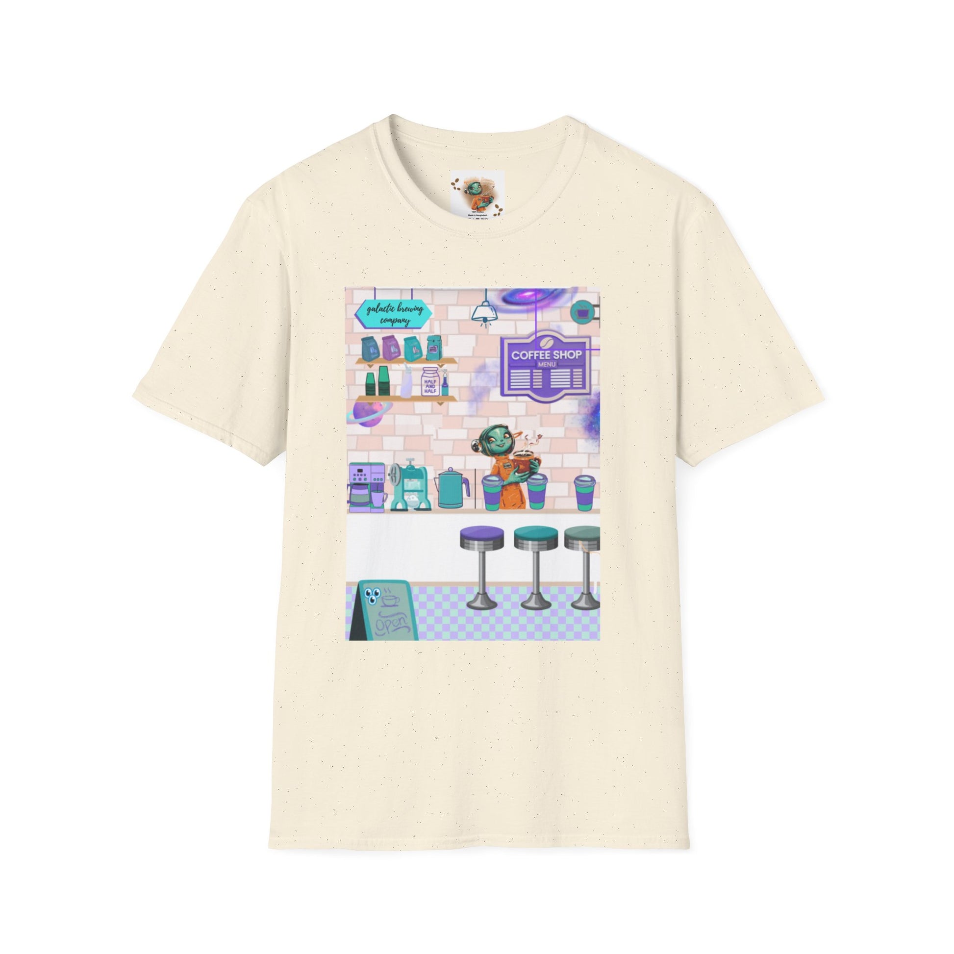 This lightweight tee carries a tiny, dreamy coffee shop tucked into a pastel galaxy. Front artwork shows a cozy counter, stools and espresso gear rendered in soft purples, teals and dusty pinks — like a late-night café imagined between stars. The back lists a playful “coffee shop menu” beneath floating planets, turning the shirt into a wearable scene that feels both familiar and a little otherworldly. Wear it on slow mornings, study nights, or while wandering city streets hunting for the next great latte. The shirt breathes easily, layers well, and keeps the illustration bright and soft against the fabric so the mood stays gentle and nostalgic wash after wash.