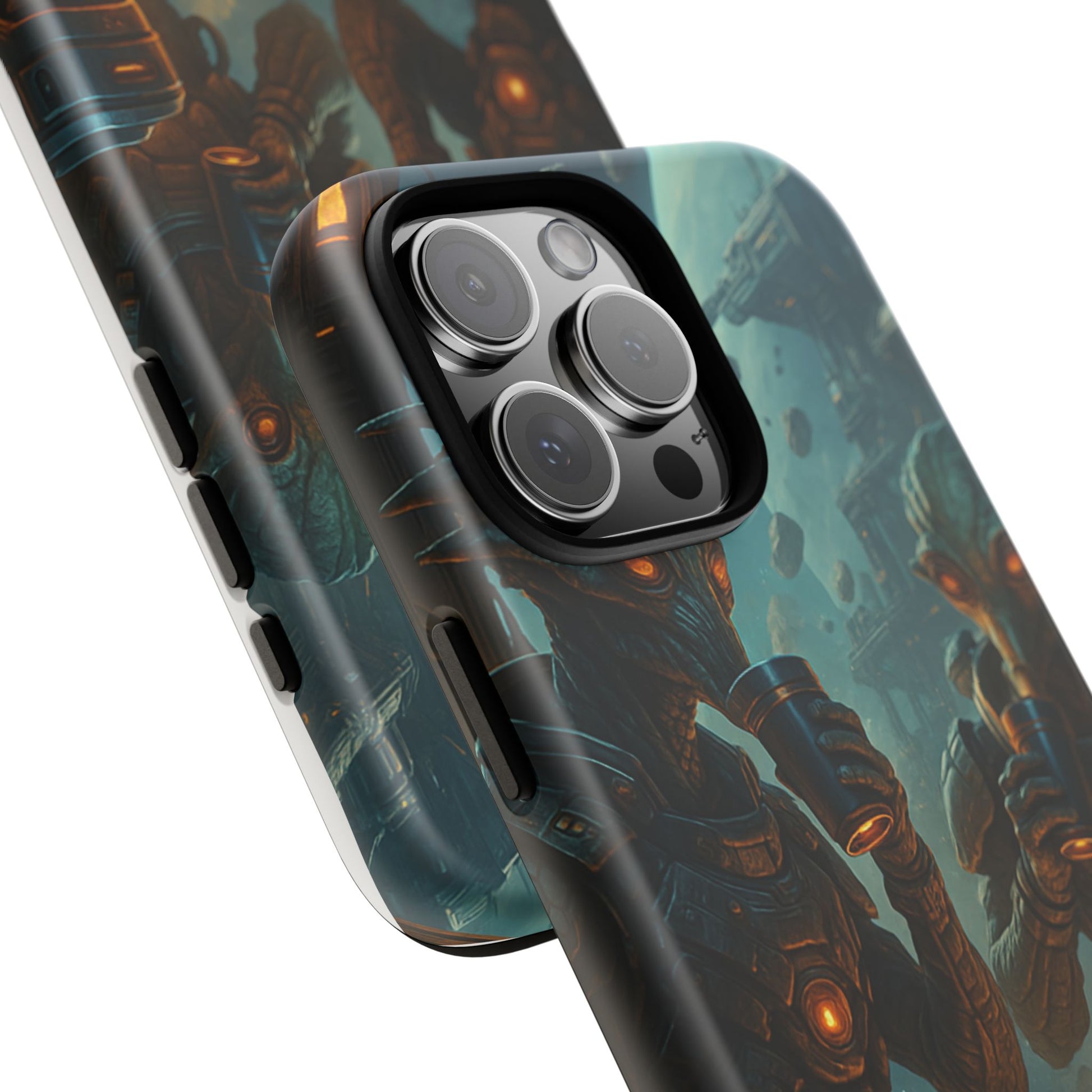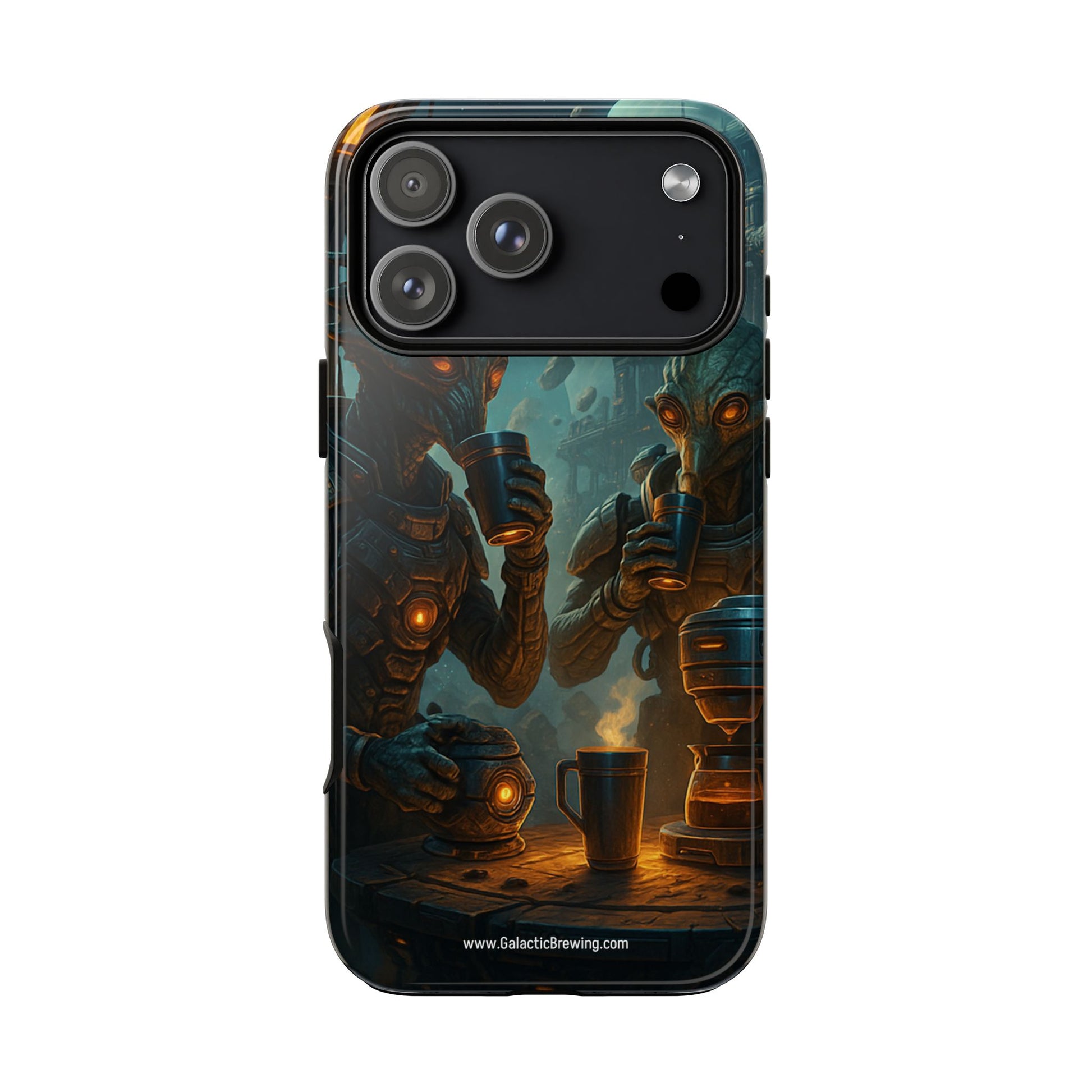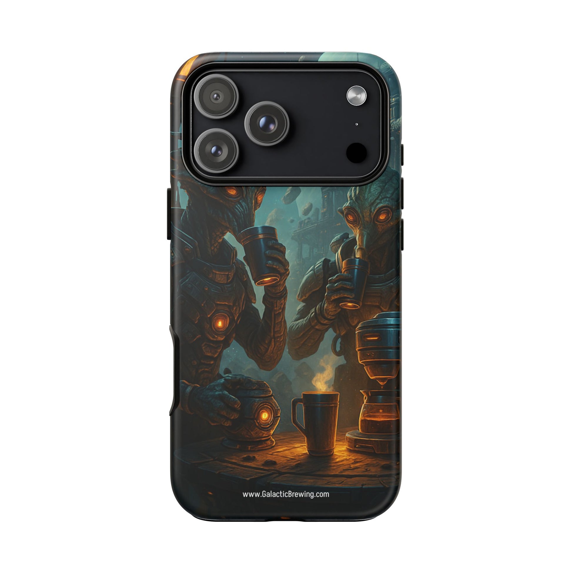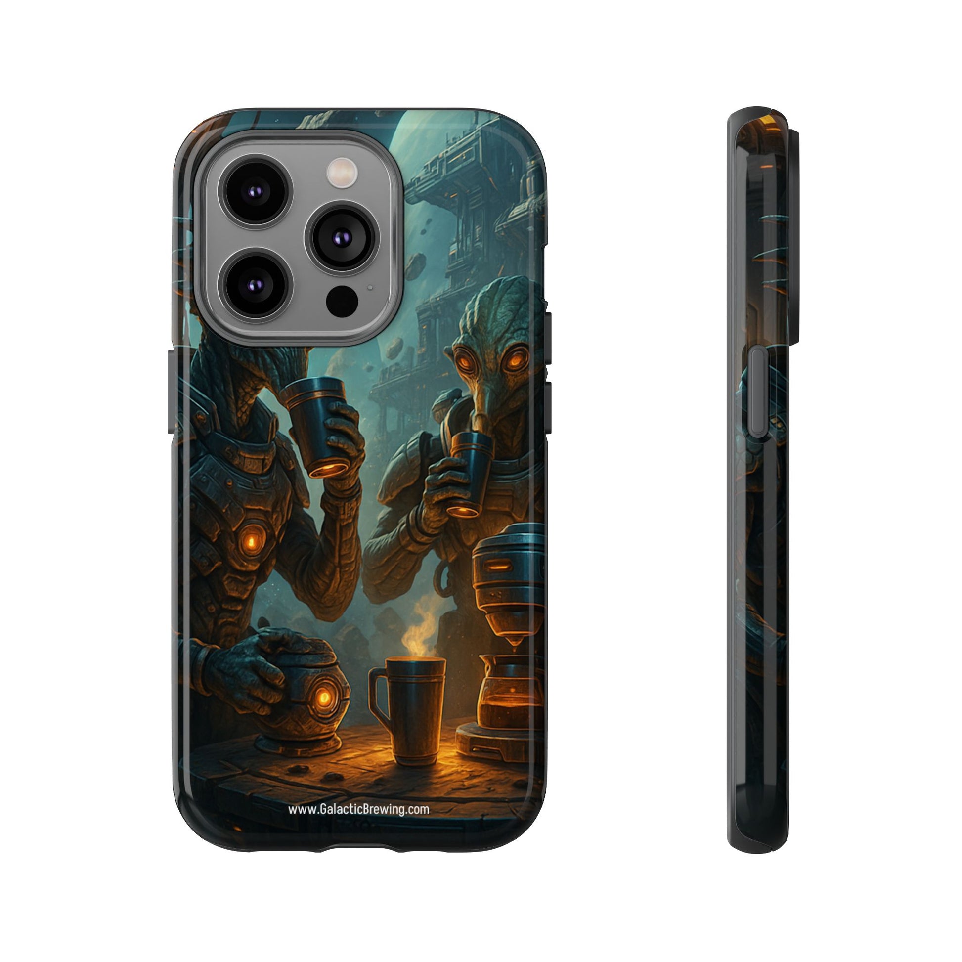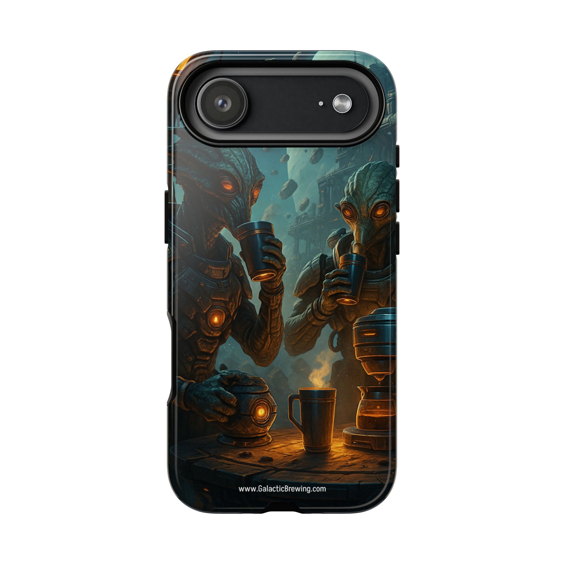 This slim, dual-layer tough case wraps your phone in retro space-age charm and dependable protection. The case features an image of our Klyrath Orbital Mix in full 3D wrap — vibrant color that resists outdoor fading thanks to UV protection. The glossy or matte finish sits over a hard polycarbonate shell and a soft TPU silicone liner that cushions drops while keeping ports accessible and wireless charging functional. It wears like a conversation starter for coffee lovers who dream of rocket-launch mornings and mid-century futurism.