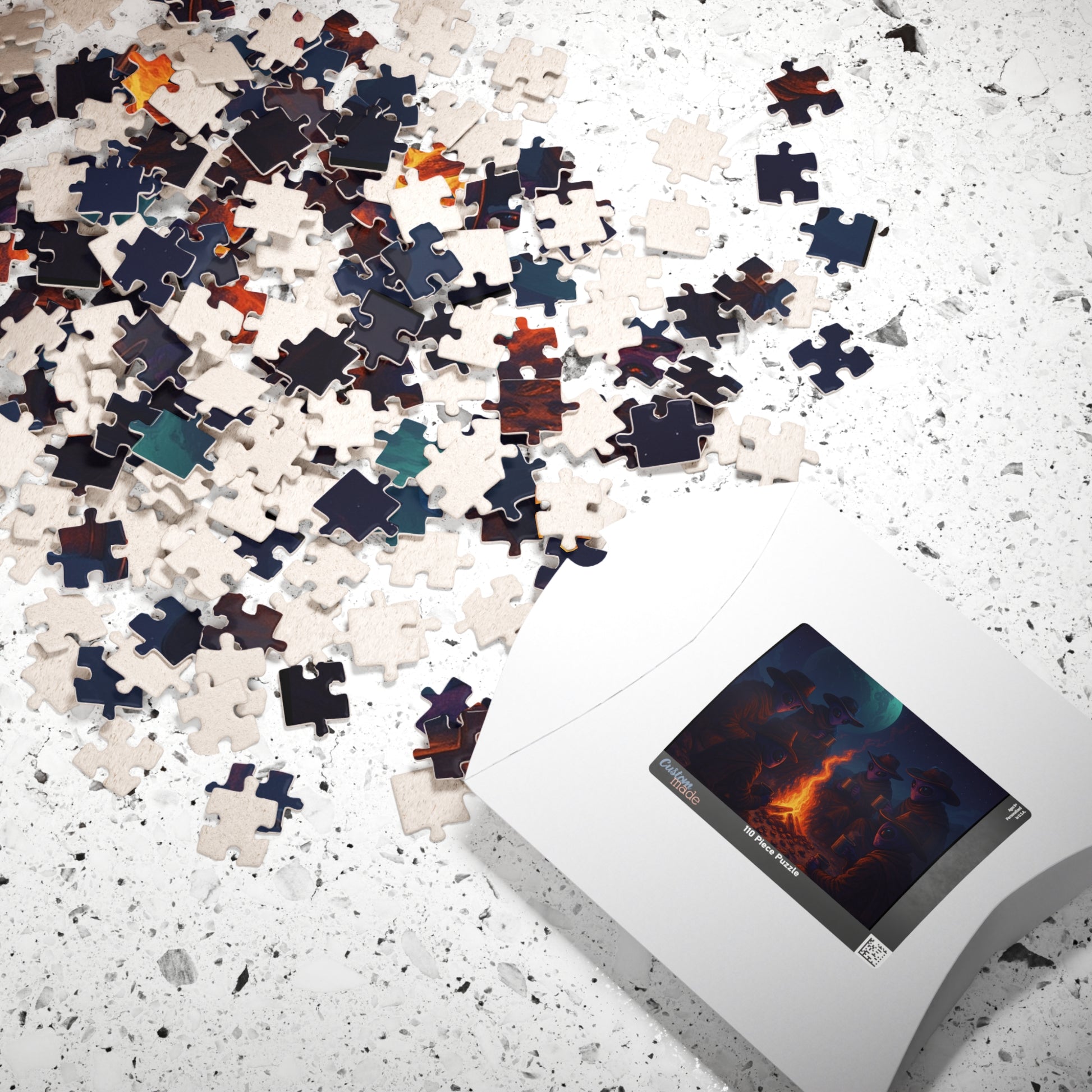 Puzzle features the Nelkvar Frontier Blend image. Each piece locks into thick, sturdy chipboard so the image holds its depth and color as you work. The glossy laminated face makes the flames pop against the deep night, pulling you into a slow, cozy ritual of focus and shared silence. It’s for quiet nights when you want to trade screens for conversation, or for those long, rainy afternoons when piecing together mood and mystery is its own reward.