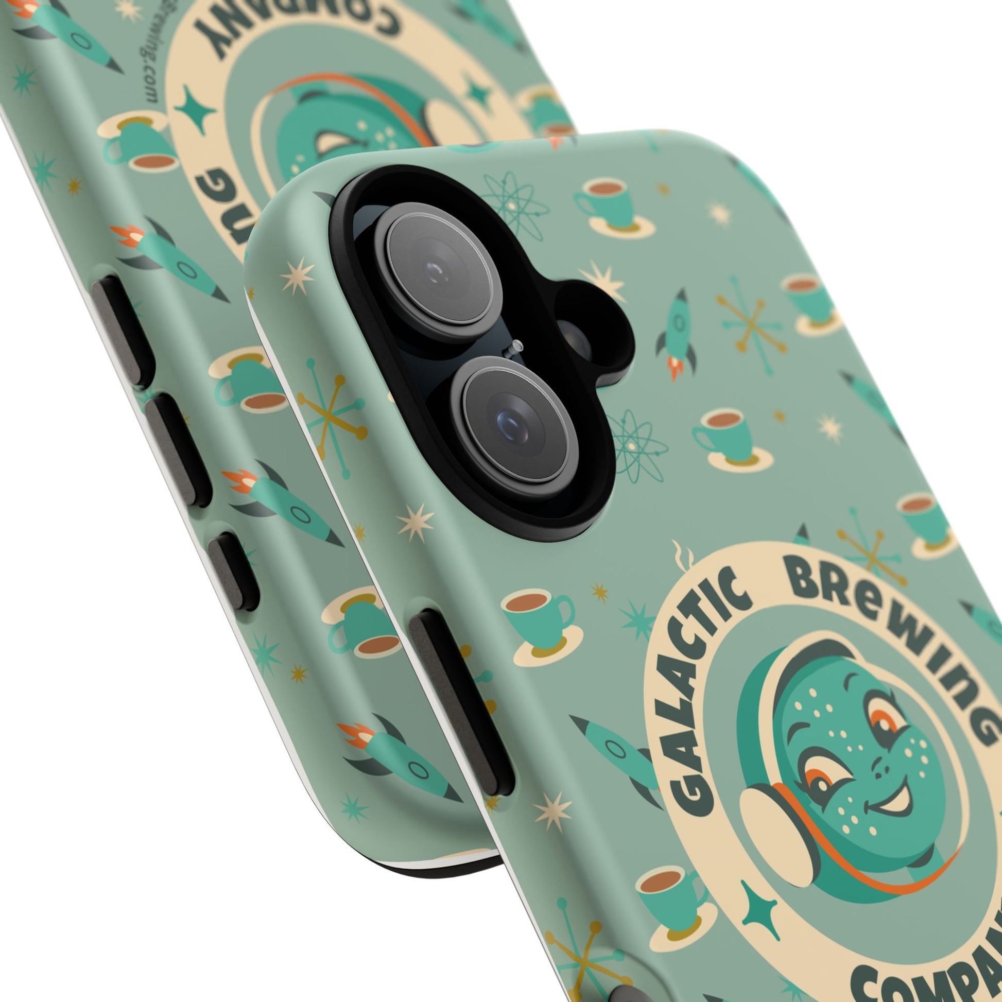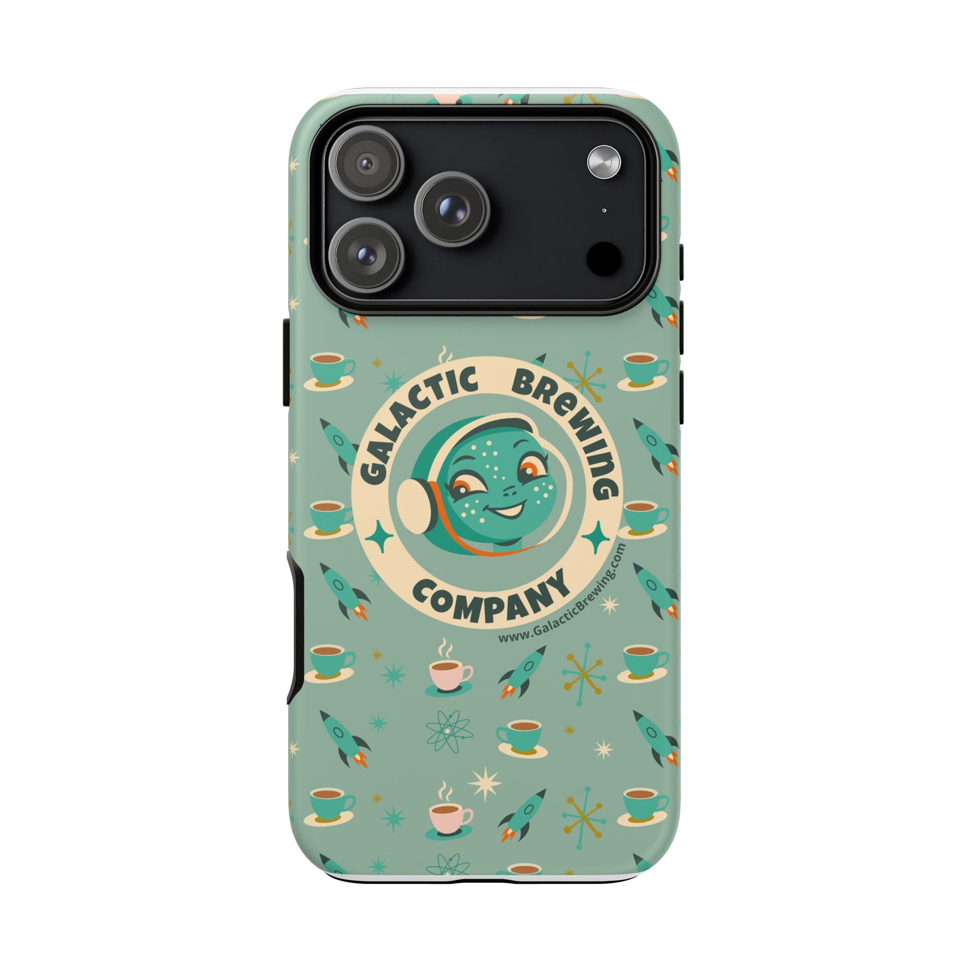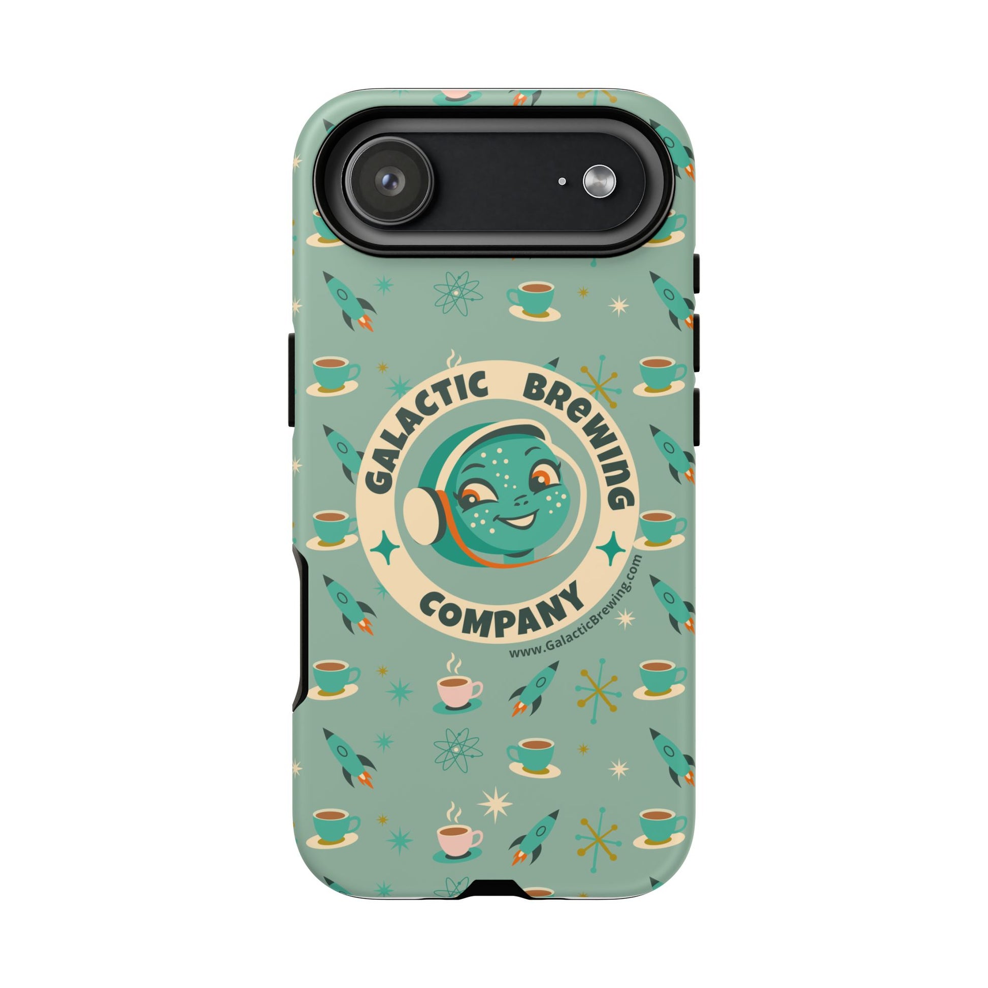 This slim, dual-layer tough case wraps your phone in retro space-age charm and dependable protection. A green-blue “Galactic Brewing Company” motif repeats alongside steaming cups, rockets and atomic stars in full 3D wrap — vibrant color that resists outdoor fading thanks to UV protection. The glossy or matte finish sits over a hard polycarbonate shell and a soft TPU silicone liner that cushions drops while keeping ports accessible and wireless charging functional. It wears like a conversation starter for coffee lovers who dream of rocket-launch mornings and mid-century futurism.