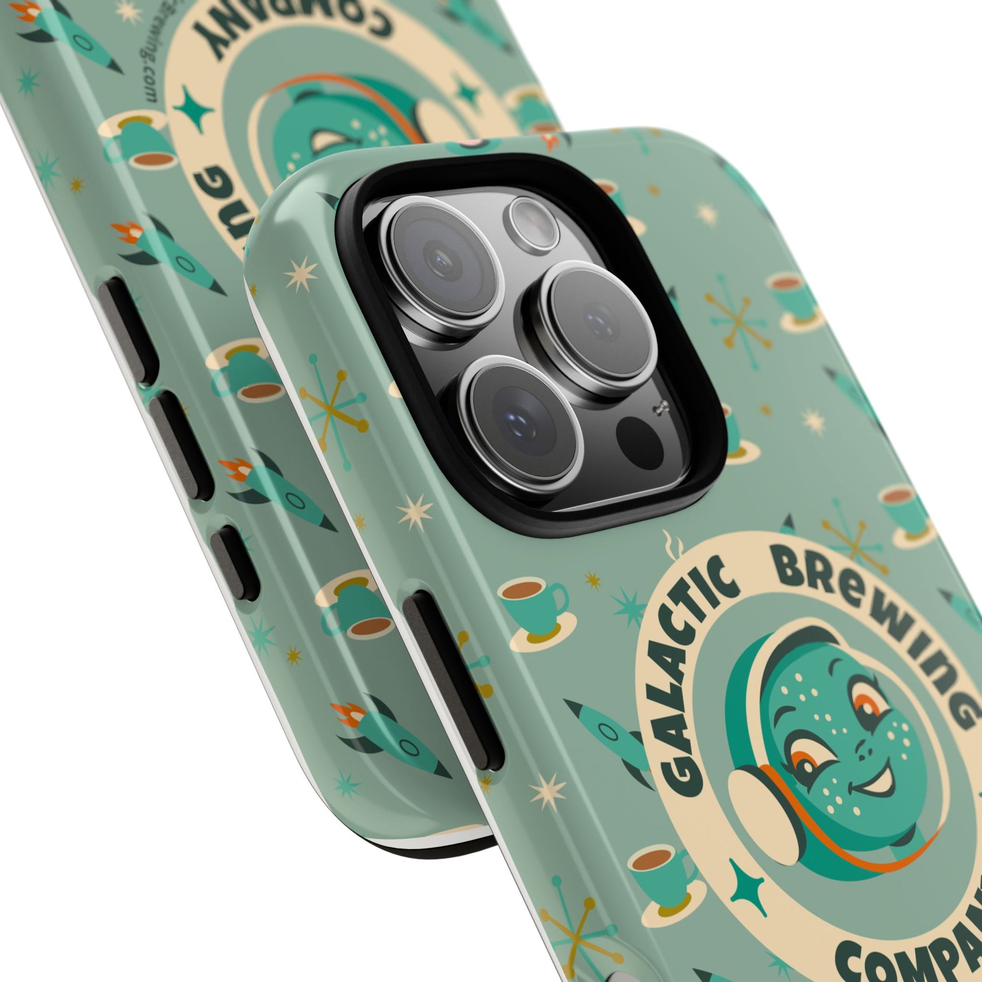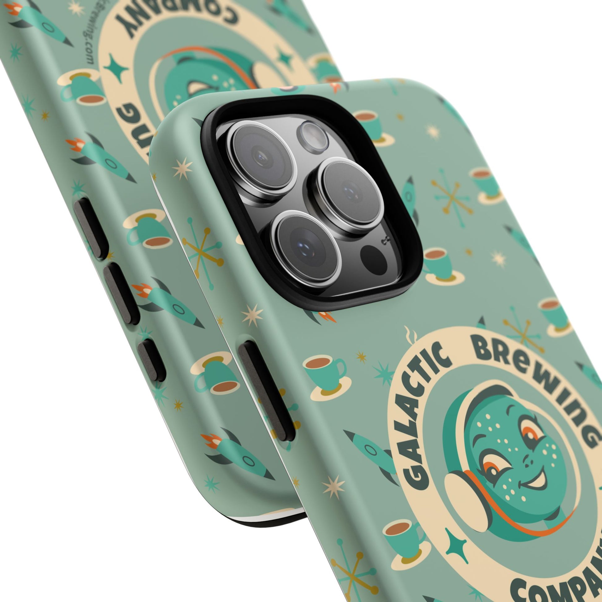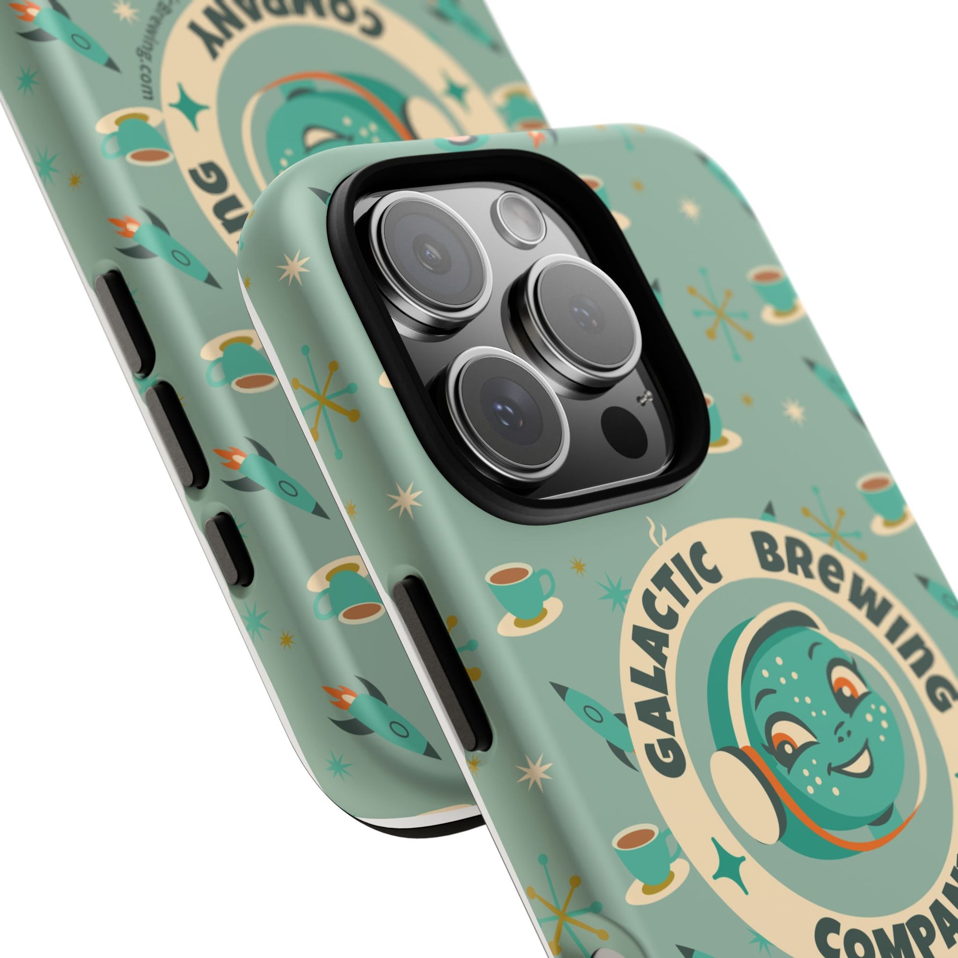This slim, dual-layer tough case wraps your phone in retro space-age charm and dependable protection. A green-blue “Galactic Brewing Company” motif repeats alongside steaming cups, rockets and atomic stars in full 3D wrap — vibrant color that resists outdoor fading thanks to UV protection. The glossy or matte finish sits over a hard polycarbonate shell and a soft TPU silicone liner that cushions drops while keeping ports accessible and wireless charging functional. It wears like a conversation starter for coffee lovers who dream of rocket-launch mornings and mid-century futurism.