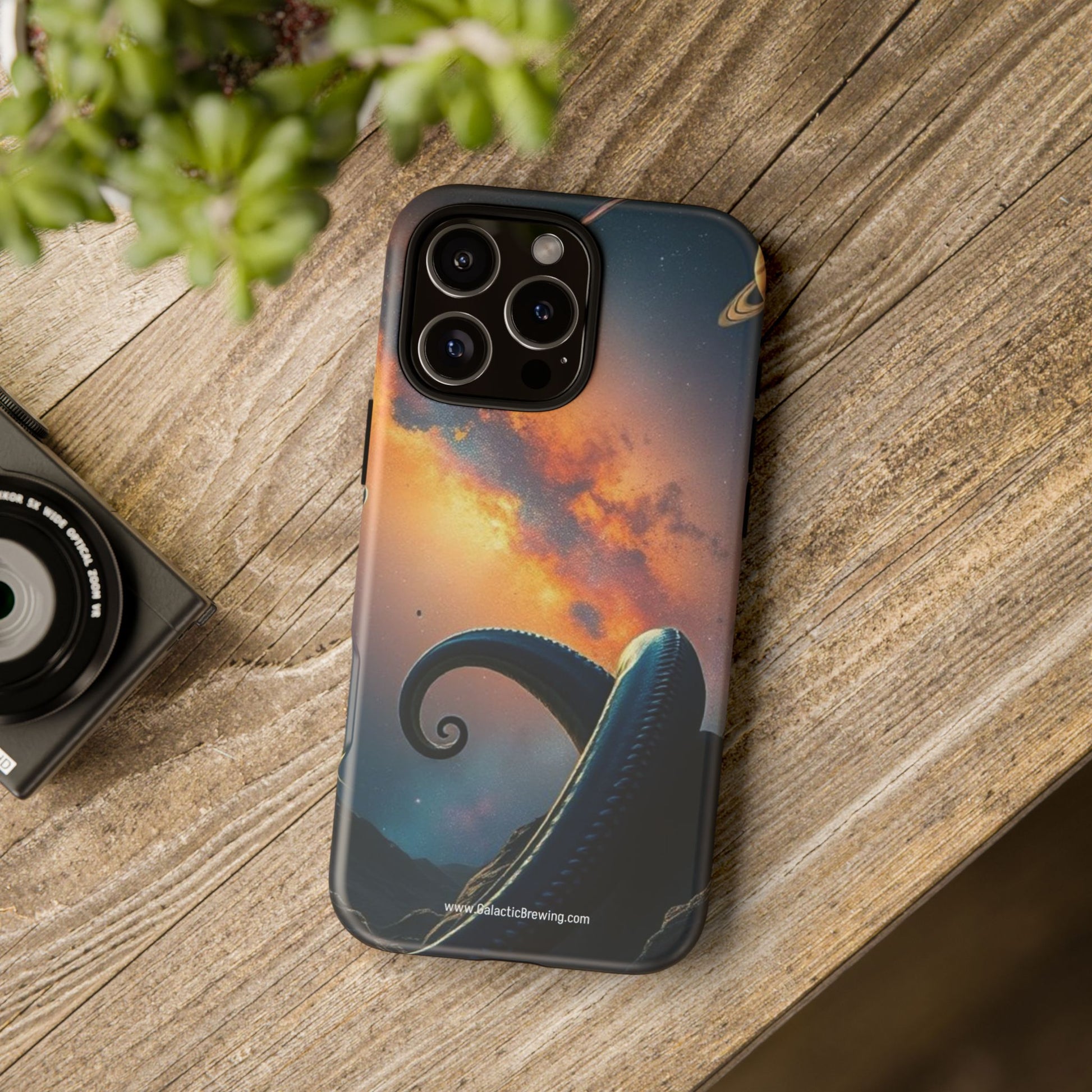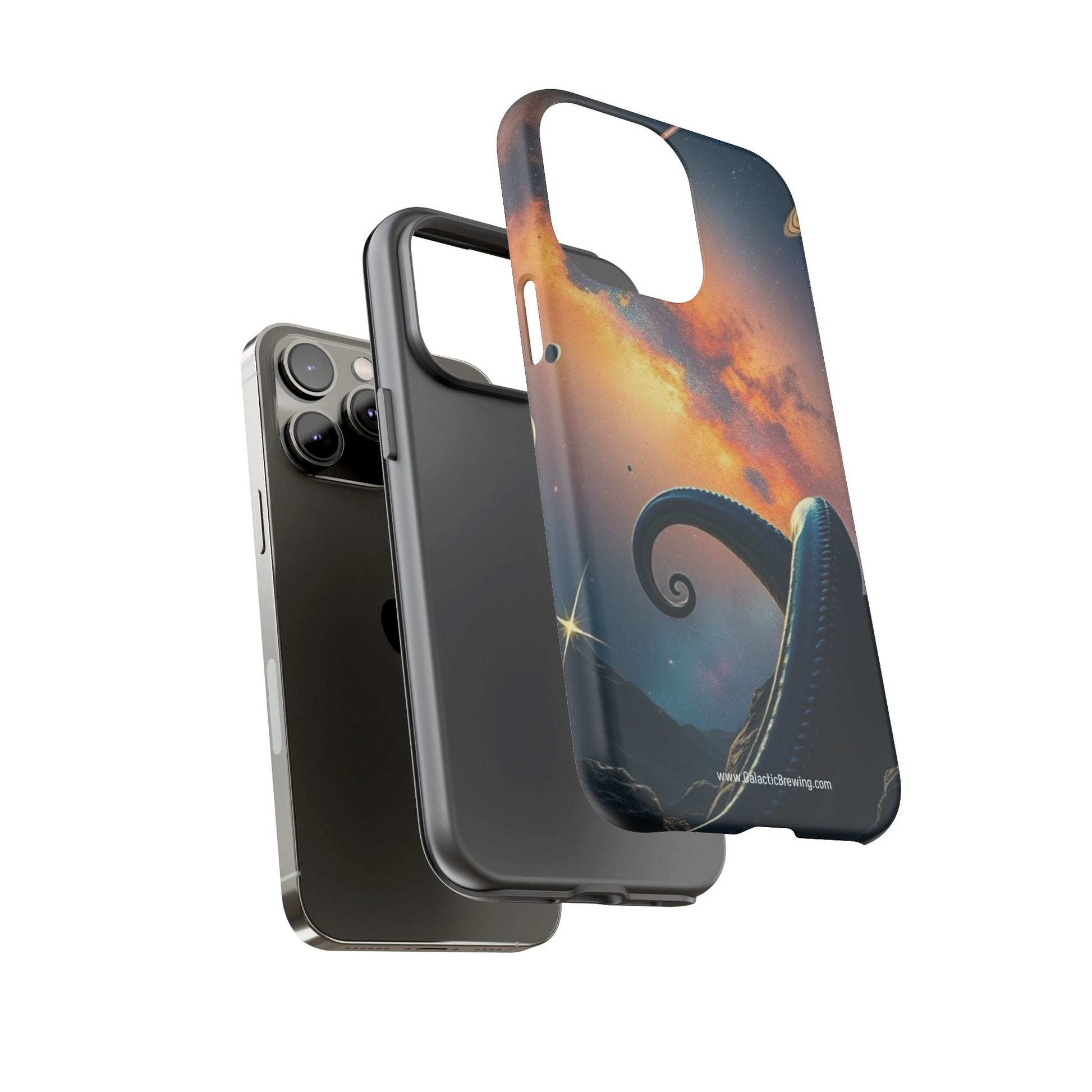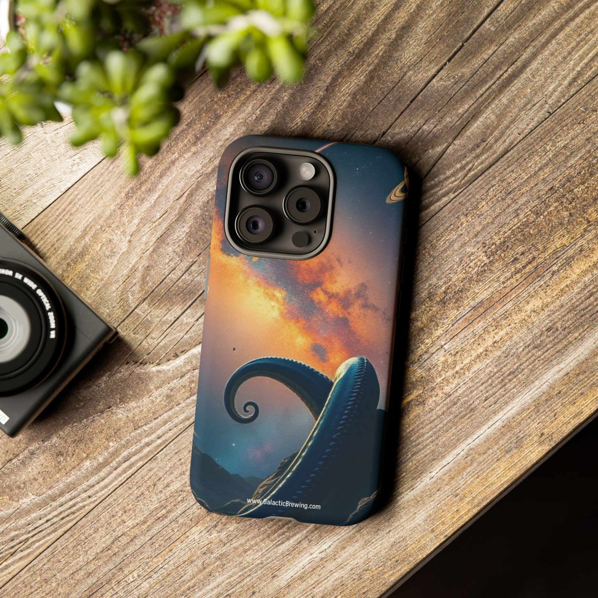 This slim, dual-layer tough case wraps your phone in retro space-age charm and dependable protection. The case features an image of our Tenticlian Light Roast in full 3D wrap — vibrant color that resists outdoor fading thanks to UV protection. The glossy or matte finish sits over a hard polycarbonate shell and a soft TPU silicone liner that cushions drops while keeping ports accessible and wireless charging functional. It wears like a conversation starter for coffee lovers who dream of rocket-launch mornings and mid-century futurism.